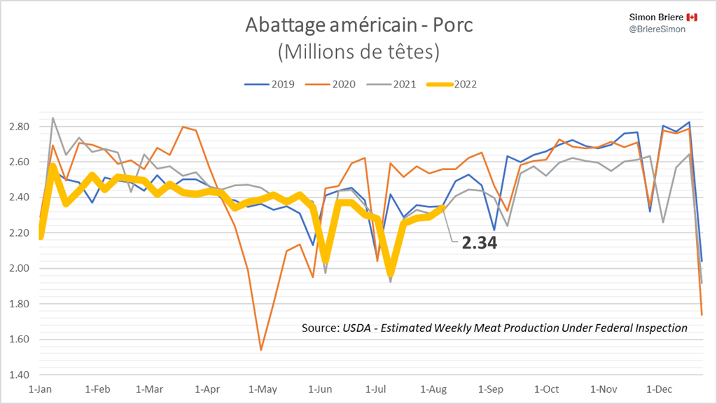 La semaine dernière, le USDA a rapporté que les producteurs avaient vendu 8000 porcs de plus qu’en 2021 pour la même semaine. Le poids moyen des carcasses est sensiblement le même qu’en 2021.