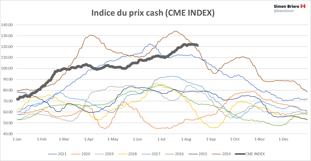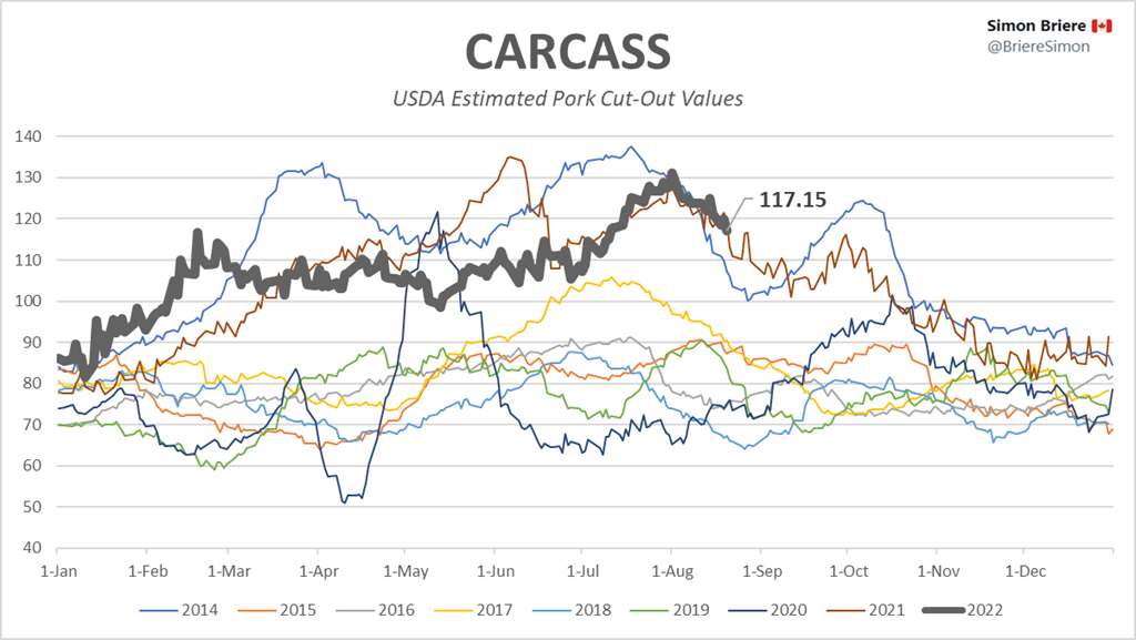 A moins qu’il n’y ait encore des révisions, le USDA prétend que l’industrie a abattu 37 000 porcs de moins la semaine dernière versus la même semaine en 2021. C’est une baisse de 1.5% du nombre de porcs versus l’an dernier. La situation continue de demeurer sous le niveau prévu dans le dernier rapport Hog & pig de juin. On prévoyait plutôt une baisse de 0.5% / 0.8% pour cette période de l’été. Par conséquent : moins de porcs! C’est probablement LA raison principale devoir des porcs au comptant à plus de $1.20 USD / livres aux États-Unis. Les abattoirs se livrent une concurrence féroce entre eux.