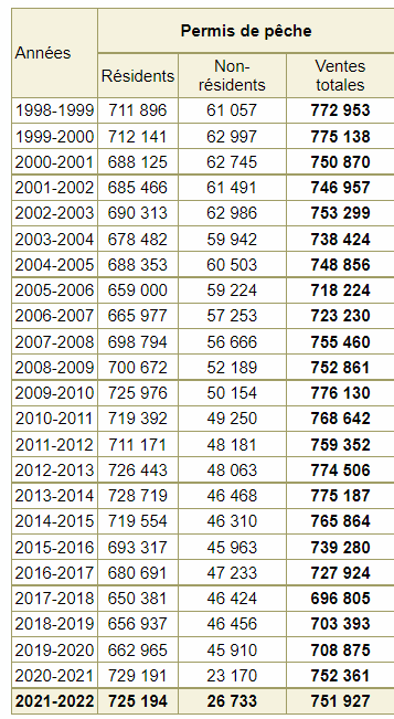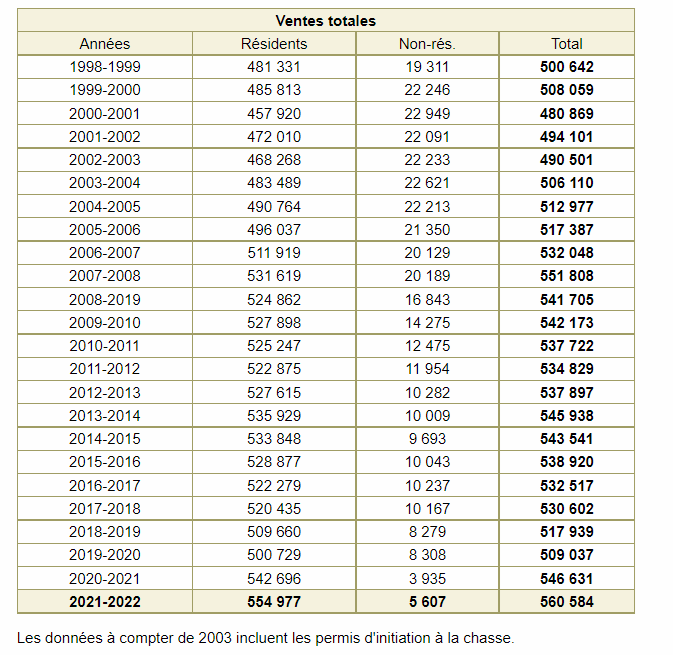 Ventes des permis de chasse au Québec ( 2021/ 2022)