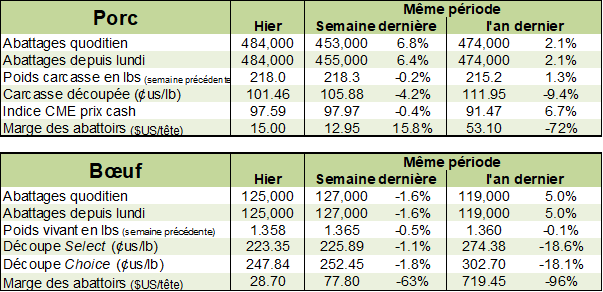 La descente aux enfers des prix du porc survient alors que le prix au comptant demeure obstinément près de $96 USD / 100 livres et que le prix de la découpe a rebondi hier soir modestement autour de $101.46 USD / 100 livres.