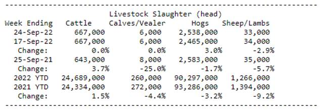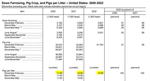 Concernant le rapport Hog & Pig qui vient (jeudi 29 septembre), il y avait un petit panel qui discutait de la croissance de l’industrie aux Etats-Unis. D’après eux, il n’y aura pas de croissance dans ce rapport-ci encore une fois. Le coûts des moulées demeure élevé, mais ce qu’ils soulignaient était le fait du manque de main d’œuvre partout et cela se voit au niveau de la productivité et des porcelets sevrés par portée. Normalement, on misait beaucoup sur cette donnée pour faire augmenter le nombre de porcs abattus, mais depuis 2021, la productivité est presque nulle. Avec les maladies ayant touché les cheptels (SPPR et DEP) depuis 2 ans, il est devenu presque impossible de faire croitre l’industrie au sud de la frontière canadienne (voir données en jaune).