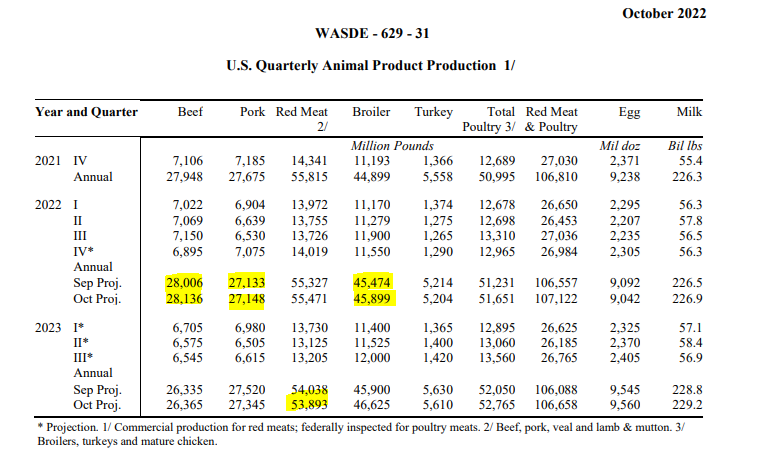 Le USDA augmente la production porcine de 15 millions de livres par rapport à son rapport de septembre. C’est comme si le USDA avait trouvé l’équivalent de 70 000 porcs de plus qui seront abattus. C’est étrange comme raisonnement puisque le rapport Hog & Pig du mois de septembre ne semblait pas décrire cette situation possible. Mais comme le USDA est l’être suprême, il faut prendre cette vérité comme étant absolue! (à moins qu’il ne change d’avis le mois suivant!) Même chose du côté du bœuf, on annonçait presque des pénuries pour la fin d’année et voilà qu’on ajoute 130 millions de livres dans la production pour terminer l’année (peut-être dû à des liquidations de cheptel puisque la qualité des pâturages demeurent très bas dans le sud des Etats-Unis). Et la volaille n’est pas en reste avec un ajustement à la hausse de 425 millions de livres!