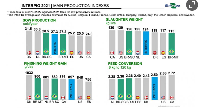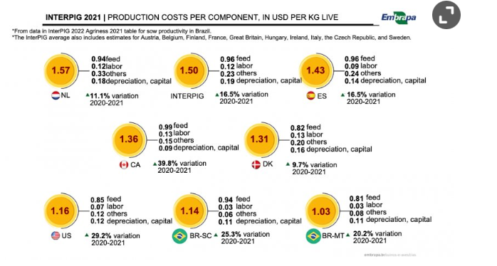 Un dernier mot sur une étude qui vient d’être publiée par Embrapa (groupe brésilien) sur les coûts de production de différents pays producteurs de porcs. Le site pig333.com publie quelques graphiques ici :