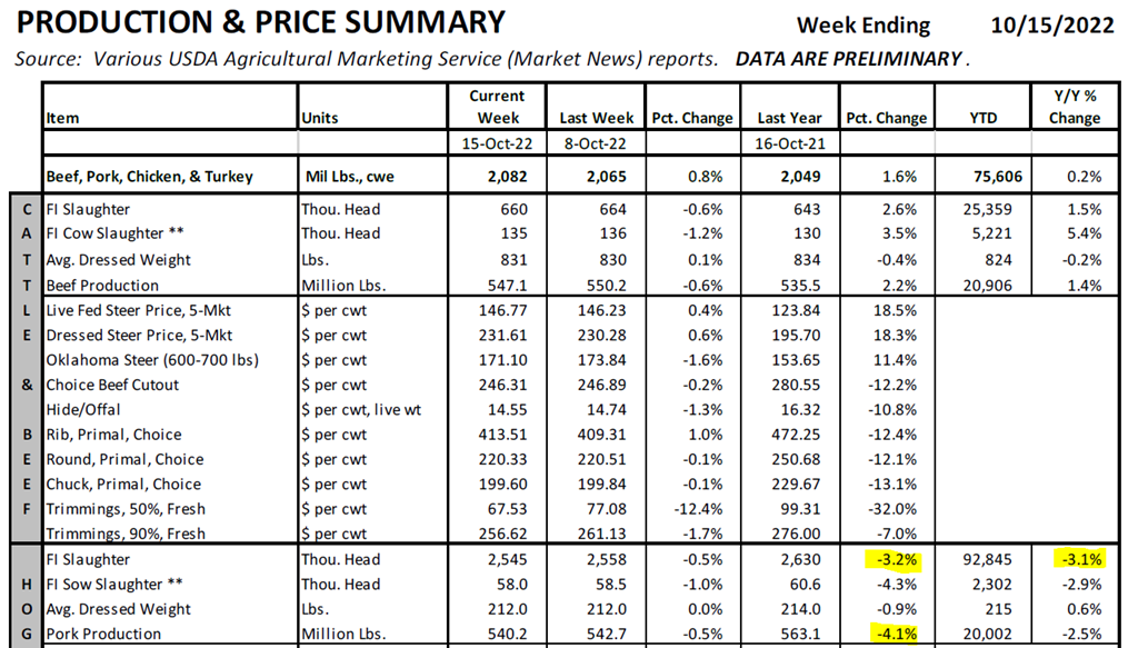 Est-ce possible d’atteindre les niveaux techniques spécifiés ci-haut? Absolument! Et ce pour plusieurs raisons. Premièrement, il faut noter la réduction des données d’abattages la semaine dernière. La quantité de porcs abattus était en baisse de 3.2% avec des poids moyens inférieurs à l’an dernier. Par conséquent, on parle d’une production de viande plus faible de 4.1% par rapport à 2021. Le dernier rapport de Hog & pig suggérait plutôt une baisse entre 1.4% et 1.8%! Aurions-nous moins de cochons? Pour combien de temps cette situation devrait-elle perdurer? Et dans le monde? La baisse de production mondiale vient aussi affecter le prix nord-américain, et ce, positivement. Un autre exemple, et pas le plus spectaculaire, mais l’Argentine annonçait connaitre une baisse de la production porcine pour les 8 premiers de 2022. Ce n’est pas important, mais cela demeure la tendance générale.