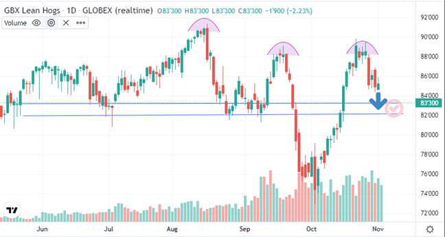 On ne sera pas surpris de voir le prix du porc fléchir dès l’ouverture ce matin. Lentement, mais sûrement on se dirige vers les niveaux techniques de $82.50 USD / 100 livres sur le contrat de décembre.