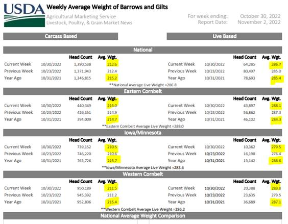 Vous connaissez mon opinion sur le sujet d’avoir plus de porcs ces temps-ci versus les attentes du USDA… on tire les porcs ‘’en avant’’. On peut suivre les données du USDA par rapport aux poids moyens de porcs abattus. Les poids carcasses des animaux abattus sont grandement sous le niveau de 2021. Le poids moyen des animaux vivants est moins révélateur. Le constat rapide demeure le fait qu’il y a moins de viande produite et offerte aux consommateurs. Pour l’instant, depuis 2 semaines, le nombre de porcs augmente, mais quand la quantité d’animaux baissera couplé avec un poids inférieur…. Mais encore une fois, c’est la découpe qui va déterminer la suite des choses. C’est elle qui dicte si le consommateur est prêt à payer le prix pour cette viande.