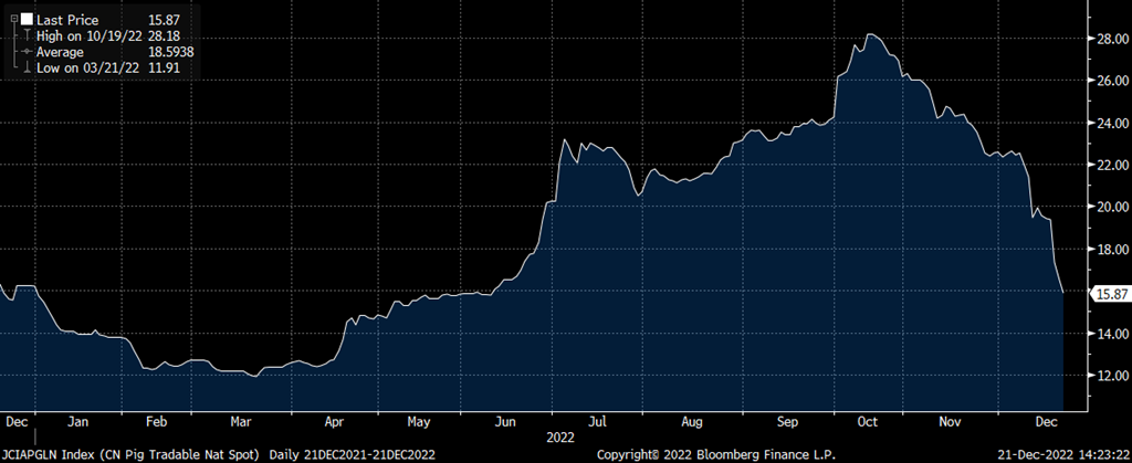 Vous le savez, si vous avez suivi un tant soit peu l’actualité automnale, la Chine a du affaiblir ou même éliminer sa politique de tolérance 0-covid en novembre / décembre dernier puisque sa population commençait à montrer les dents face aux autorités. Cette politique du Gouvernement central a entrainé plusieurs conséquences humaines, mais aussi économiques dans le pays de Xi Jinping. Le ralentissement se fait sentir partout, les pertes d’emploi se multiplient. Alors que le monde est en ralentissement économique, la Chine essaie de relancer son économie par divers mesures. Et pour atténuer les effets sur sa population, elle tente en plus de juguler l’inflation alimentaire. Pour calmer le jeu récemment, (on ne le sait pas vraiment, mais on peut sous -entendre) les autorités ont probablement multiplié les appels pour abattre du porc. Le prix est descendu en flèche comme si on voulait provoquer cette baisse artificiellement. Les célébrations du Nouvel An chinois en janvier y sont surement pour quelque chose. Le hasard fait bien les choses… Déjà, au 1er novembre, l’État en était à sa 7ieme intervention pour libérer du porc des réserves nationales.