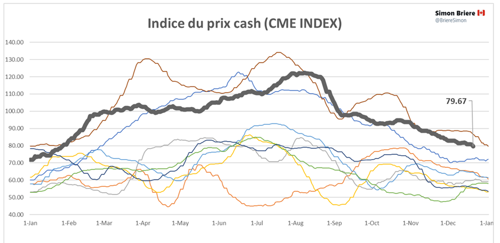 Donc, une misère temporaire présentement qui pourrait se prolonger jusqu’en janvier. Normalement, la saisonnalité des contrats à terme fait en sorte que nous devrions connaitre une fin d’hiver intéressante.