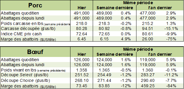 Pour appuyer ses propos, on peut noter la baisse des poids moyens des porcs envoyés à l’abattage. Bien que les poids moyens des porcs vivants soient neutres versus 2022, on note que les carcasses sont très nettement sous les moyennes (entre 2 et 4 livres en moins!). En pourcentage, on parle de presque 1,5% Par conséquent, même si on a 2% plus de porcs, avec des poids 1.5% inférieurs, on se retrouve avec à peine plus de viandes qu’en 2022…. Et ce, pour l’instant! Puisqu’on se questionne à savoir pourquoi nous avons plus de porcs ces temps-ci. C’est encore le principe de qui vient en premier entre l’œuf et la poule? Est-ce que les producteurs, voyant le prix cash baisser envoient leurs porcs plus rapidement dans les bras des abattoirs qui diminuent leur prix cash en conséquence? Ou encore les abattoirs tirent sur leur approvisionnement futur pour remplir des carnets de commande des grossistes qui veulent profiter d’un prix d’amis sur le cutout? Toujours étrange de voir le prix des découpes de bœufs continuer de grimper à des niveaux stratosphériques alors que le prix du porc continue de languir dans les bas-fonds des 2 dernières années.