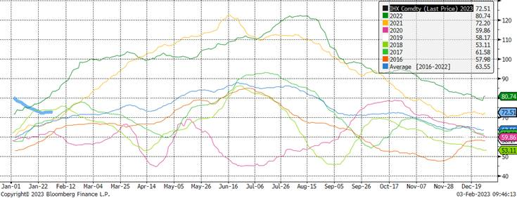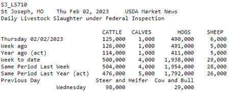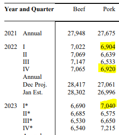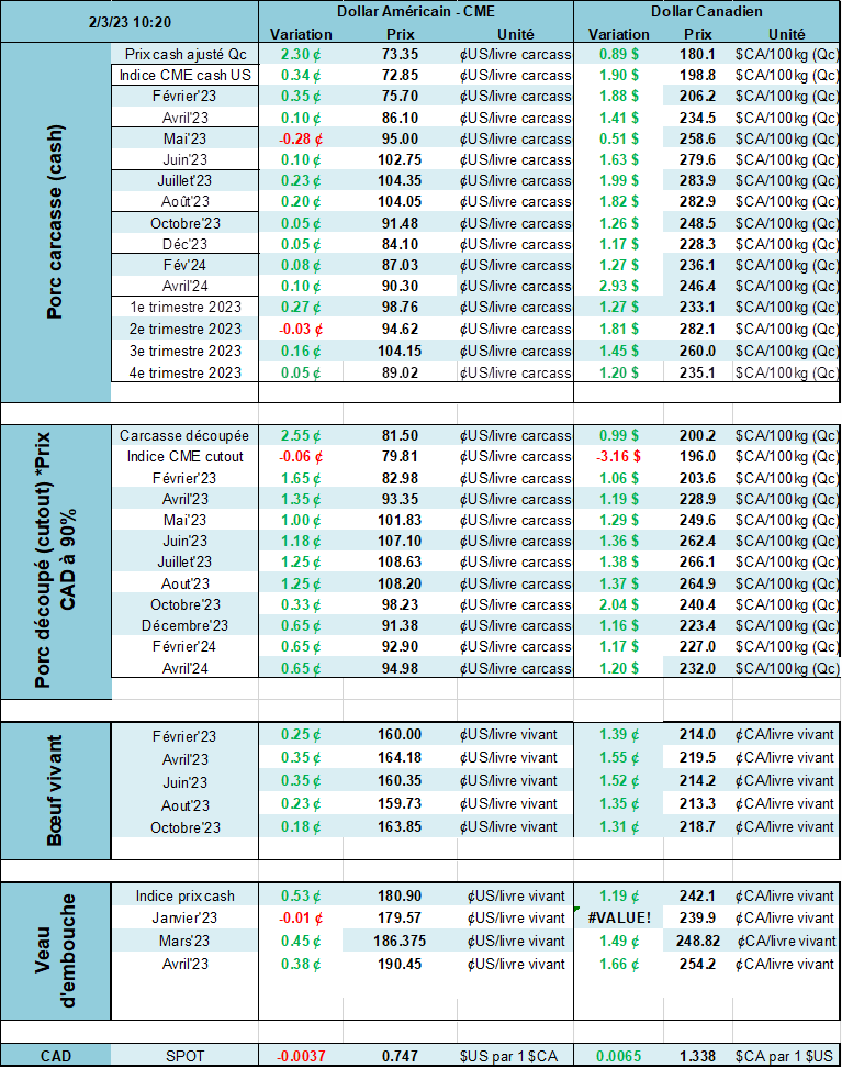 Le marché voit toutes les données de production du porc avec un œil suspect. Premièrement parce que les abattages sont tellement au-dessus de ce qui était attendu. Juste pour les 4 jours cette semaine on parle de 146 000 de plus qu’en 2022! Encore une fois, nous sommes bien loin du 2% de baisse prévu en décembre dernier. Tout le monde parle depuis des jours du fait que le USDA prévoit une augmentation de la production de viande porcine durant le premier trimestre de 2023 versus le dernier trimestre de 2022. Une situation qui n’arrive vraiment pas souvent. En fait, cette situation est arrivé seulement 1 fois depuis que le USDA compile les données. Normalement, la quantité de viande diminue entre 100 et 300 millions de livres entre ces mois, mais cette année on prévoit une augmentation de 120 millions de livres versus le dernier trimestre de 2022. Est-ce que cette simple donnée est suffisante pour faire dérailler le train du porc? Est-ce LA raison principale pourquoi les spéculateurs ont poussé pour faire baisser les prix tout au long du mois de janvier? Peut-être. Quand on compare la production de janvier à mars 2023 versus les mêmes mois en 2022, le USDA prévoyait une hausse de 1.97% dans la viande produite. Question de journée ouvrables? Probablement que oui….