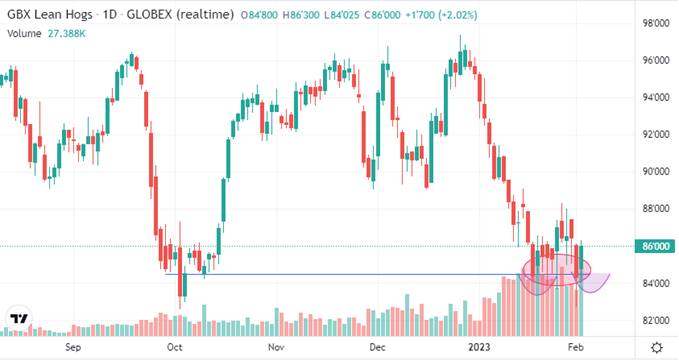 A-t-on vu la fin de la baisse dans les prix du porc? Peut-être! Les contrats à terme ont bien tenté de baisser à plusieurs reprises cette semaine, mais finissaient presque toujours à revenir sur les niveaux de la veille ou ne réalisaient de nouveaux creux. Hésitation dans les creux, double -bas réalisé, de bons volumes de contrats transigés, il me semble que techniquement tout est en place pour vivre un rebond sur les prix. Mais évidemment tout peut basculer si un événement comme la peste porcine africaine faisait son entrée aux Etats-Unis.