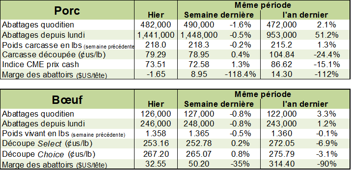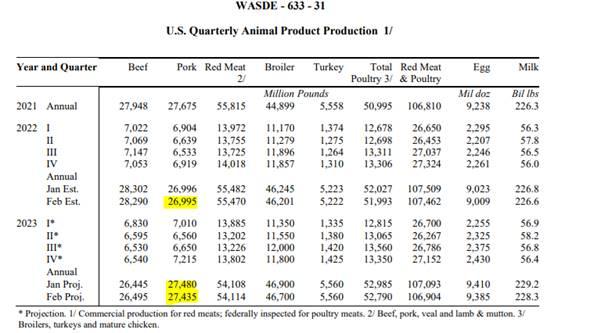 Le USDA, hier dans son rapport de grains, a commencé à réduire la production de viande de porc prévue en 2023. Vous allez surement dire : ‘’seulement 45 millions de livres!’’ C’est vrai, mais ça commence comme ça… Il faut souligner que l’organisme prétend que la production augmentera tout de même de 1.6% en 2023 versus 2022. Alors qu’au même moment, le USDA voit moins de porcs abattus versus l’année précédente… Un calcul qui laisse songeur, mais il faut souligner peut-être le nombre de jours d’abattages supplémentaires en 2023.