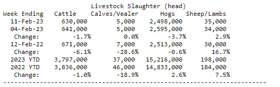 Les prix du porc en Amérique du Nord ont-ils grimpé en raison de la diminution du nombre de porcs abattus la semaine dernière? En effet, pour la première fois en 2023, le nombre de porcs abattus était INFÉRIEUR à la même semaine en 2022. Encore une fois, rien de dramatique, mais serait-ce le début de ce nous attendons tous? En baisse de 0,6%, les données sont encore loin des attentes du USDA de décembre 2022.