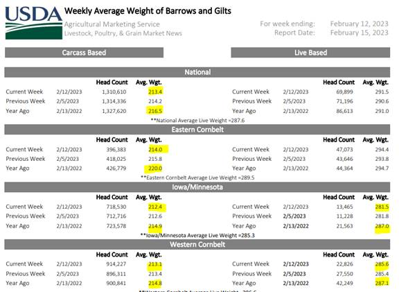 Serait-ce plutôt le poids moyen des porcs abattus qui fond comme neige au soleil sur un trottoir montréalais? J’ai été fort surpris de constater les poids moyens rapportés par le USDA hier. Non seulement les carcasses sont nettement plus légères, mais aussi les poids des animaux vivants!