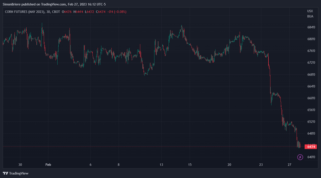 Une baisse de 40 cents dans le blé d’inde. De 6.83 à 6.43 sur mai. (-6%)