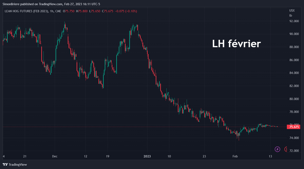 Justement au niveau de l’élevage on a vu les prix du porc reculer significativement depuis le début de l’année. Les cours du contrat de février qui a expiré récemment n’ont pas du tout bien fini en passant de 90 cents la livre à Noel à 75 cents en prix de fermeture… Oups. En fait c’est inusité car la production est en baisse! Normalement ce qui est rare vaut cher, mais pas dans ce cas si. En fait le prix est en constante équilibre entre l’offre et la demande. Dans un contexte où il y a moins de porc, on aurait pu penser que le prix allait monter. C’est logique. Cependant, on a tendance à oublier que le consommateur n’est peut-être pas au rendez-vous « à ce prix-là ». Puisque la viande est un produit périssable, malgré le sous vide, le congelé, etc… le timing de la consommation est aussi très important. Ce n’est pas comme un deux-par-quatre dans la cous à bois ou on peut facilement l’entreposer pour plus tard. Donc, dans le contexte d’inflation, de hausse des taux d’intérêts et de compression sur le budget des familles, j’en ai déduit que le porc était trop cher pour s’insérer dans le panier d’épicerie et c’est pour cette raison que le prix a chuté.