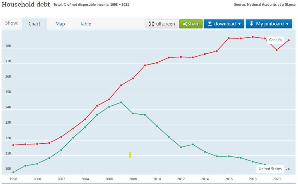 L’économie est en danger selon moi. L’endettement est époustouflant au Canada; on parle de 180% d’endettement des ménages. C’est-à-dire que pour chaque tranche de 100$ de revenu disponible, les Canadiens sont endetté de 180$. C’est MAJEUR : c’est pratiquement le double des États-Unis! Dans un contexte où les taux d’intérêts ont fortement augmenté – on est rendu à presque 7% sur les hypothèques, tout ça n’est pas de très bon augure. Quand on pense que plus du deux tiers de la croissance (le PIB) provient de la consommation on comprend bien que si tout y passe dans l’hypothèque, il ne restera plus beaucoup pour faire rouler l’économie comme on l’a fait depuis une génération. Ça fait 30-40 ans qu’on s’endette pour faire virer l’économie, mais aujourd’hui ça nous rattrape. On a mis l’inflation en échec pendant toute cette période en déménageant nos industries à l’autre bout du monde parce que cela coutait moins cher à produire. Cette mondialisation a permis de maintenir l’inflation très faible, et permis au banques centrales de laisser les taux (trop) faible et (trop) longtemps. En ce moment c’est comme si on se réveille d’un lendemain de veille et qu’on constate que le party est fini.