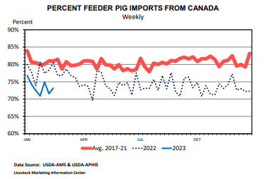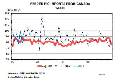 Depuis quelques jours, certains clients me disent que plusieurs porcelets quittent le Québec pour le Sud. Non pas la Floride ou Punta Cana, mais vers des destinations moins exotiques comme l’Iowa, le Minnesota et autres États américains du Nord. Dans la publication du DailyLivestock report du 6 mars, Steiner discutait de cette situation. En 2022, les Etats-Unis ont importé 6.5 millions de porcs et porcelets, en baisse de 2.7% par rapport à 2021. Quand il regarde les chiffres des 7 premières semaines de 2023, on remarque une hausse des exportations canadiennes de près de 8000 porcs par semaine (en moyenne versus 2022). Quand on y regarde de plus près la proportion de porcs prêt à l’abattage prend un peu plus d’importance que d’habitude. Ça semble être notre réalité pour les prochains mois malheureusement.