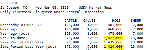 Dans le rapport du grains publié hier par le USDA, il faut souligner que l’organisme a encore réduit la production de viande porcine pour 2023. Pas grand-chose direz-vous, mais on note que le poids moyens des carcasses de porc est inférieure à la normale et cette donnée a fini par forcer la main du USDA. Malgré la réduction de viande annoncée durant le 1er et 2ieme trimestre de 2023, le USDA n’a pas ajusté à la hausse ses prix? Les analystes semblent assez surpris de cette situation.