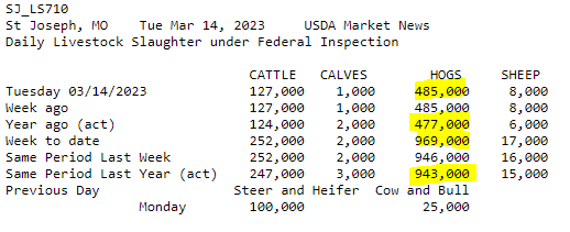 Pour le monde porcin, ça implique différente choses… 1) une baisse lente et régulière du dollar CAD (ce qu’on a vu récemment), et 2) une baisse des taux sur les marges de crédit. Pour le prix du porc, c’est mitigé…. Même si les experts mentionnent que le prix au détail est jugé sûr contre la récession, le comportement depuis 3 mois nous permet d’en douter. Pourtant, le prix des veaux et des bœufs demeurent près de leurs sommets de prix historique. Ça fait longtemps qu’on se pose des questions sur le pourquoi du prix si peu élevé des prix du porc. Certains mentionnent que les abattages ne diminuent pas aux Etats-Unis et ils ont raison de le souligner. D’autres disent que la quantité de viande produite durant le 1er trimestre est en hausse (versus l’historique des dernières années). C’est encore 26 000 porcs de plus cette semaine versus 2022. Au risque d’avoir l’air d’un vinyle qui saute, on devait avoir moins de porcs cette année selon le USDA. Vivement le rapport de mars (30 mars) pour y voir plus clair et essayer au moins de comprendre ce qui a pu se passer. J’ai de plus en plus l’impression que certains intégrateurs auraient oublié des porcs…. Avec la fin du monde qui s’abat dans les marchés financiers, il sera très difficile pour le prix du porc de s’extirper de ce marasme à court terme.