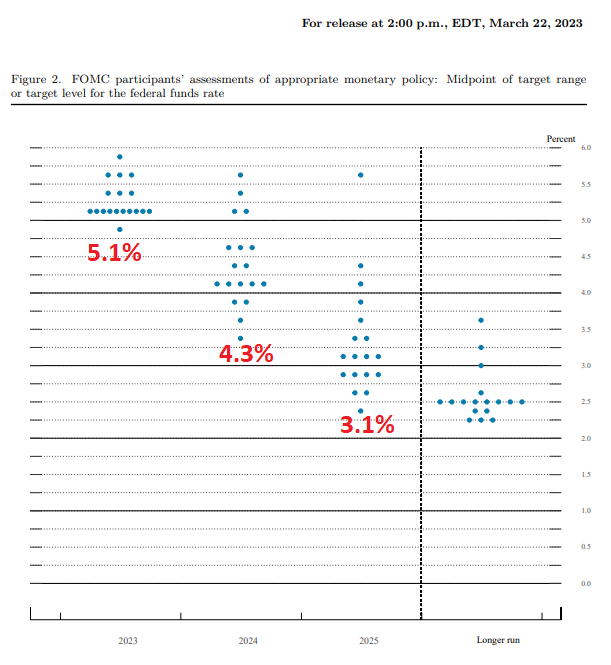 10 Alors voilà, la Fed qui nous dit que les taux vont probablement rester élevé un « certain temps ». Selon les membres de la FED, les taux seraient de 5.1% en 2023, 4.3% l’an prochain pour ensuite se stabilier à 3.1% par la suite…