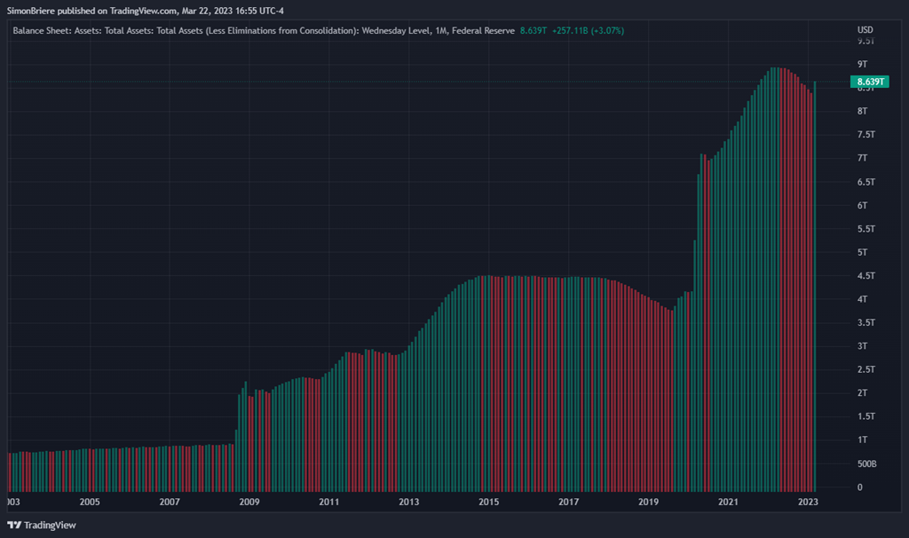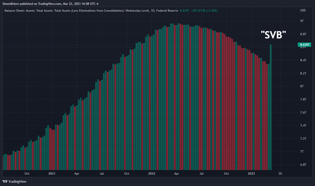 3 La réserve fédérale (la Banque du Canada aussi) nous dit depuis un temps que cette période est révolue, qu’on est dans un resserrement monétaire. Mais c’était avant le fiasco des banques comme Silicon Valley Bank (SVB) et le gouvernement fédéral a dû venir en aide. Je simplifie, mais c’est pas mal ca pareil. À ce moment tout le monde pensait que le QE est de retour! Que le cheap money allait revenir! Make it Rain! Les taux vont bien chuter! Not so fast…
