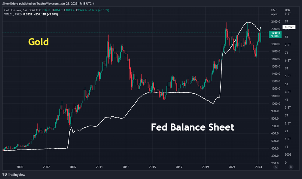 7 Et ça, d’autres actifs financiers le sait très bien. L’or, par exemple ; bien souvent utilisé comme valeur refuge pour contrôler l’inflation. Ce n’est pas parfait comme corrélation, mais on voit comment le cours de l’or a été influencé par le bilan de la Fed.