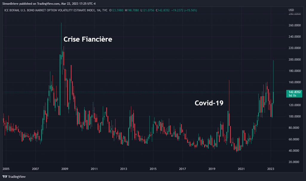 9 En ce moment, tous les yeux sont rivés sur les taux d’intérêts. C’est normal, c’est là que la game se joue! Je peux calculer la volatilité du marché obligataire (dérivés de taux d’intérêts). On vit dans une période volatile qui ressemble à 2007/2009 et le début de la pandémie…