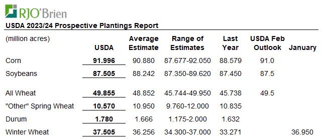 Si j’étais pour résumer le tout très simplement, le rapport est positif pour les prix du soja, et un peu négatif pour le reste. N’oubliez pas que ce rapport représente les INTENTIONS et il n’y a pas de révision du bilan offre-demande ou de rendement avant le mois de mai pour la nouvelle récolte. Le rapport donne juste les stocks et le semis, rien d’autre. Pas d’éthanol, pas d’exportation, etc… Voici les acrages bing bang.