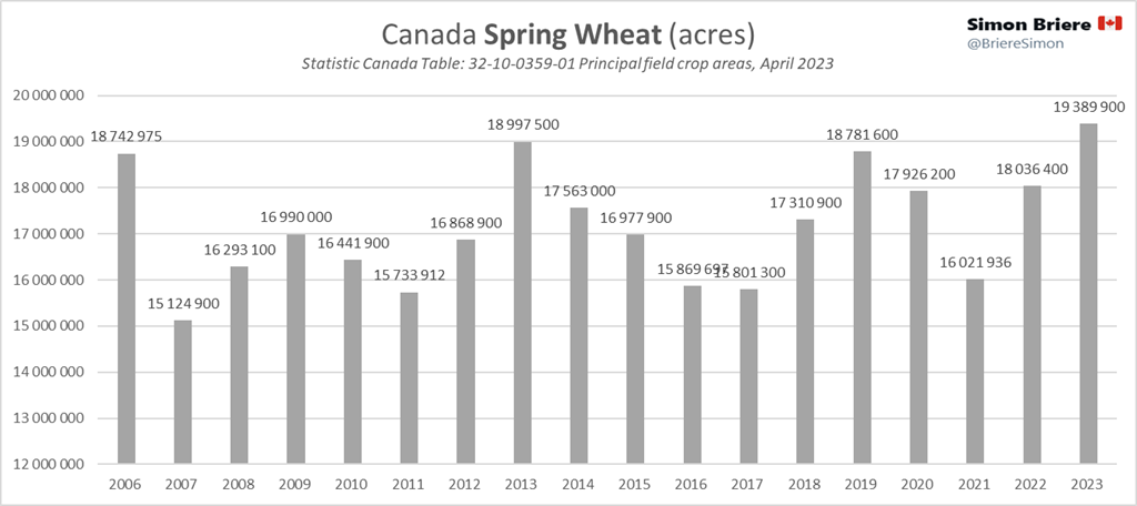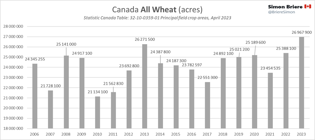 D’entrée de jeu StatsCan nous dit que pas mal toutes les cultures sont en augmentation. « En 2023, les agriculteurs canadiens s'attendent à ensemencer plus de blé, de canola, de maïs-grain, d'orge et de soya, tandis que la superficie ensemencée d'avoine, de lentilles et de pois secs devrait diminuer par rapport à l'année précédente. Compte tenu de l'intention des agriculteurs de semer une plus grande superficie de blé, de canola, de maïs-grain et de soya, la superficie ensemencée consacrée aux céréales et graines oléagineuses devrait augmenter, tandis que la superficie consacrée aux légumineuses et aux cultures spéciales devrait diminuer. »