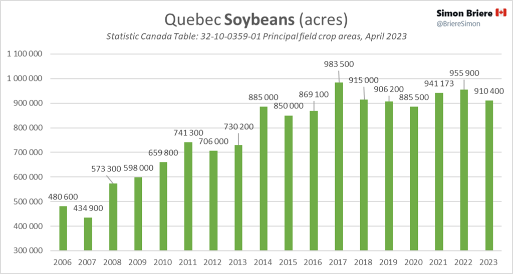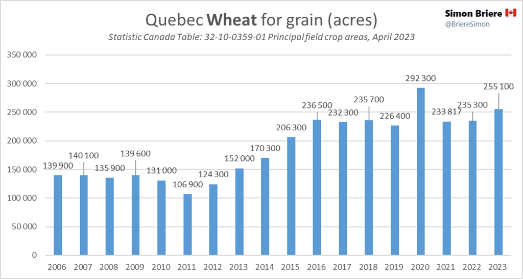 Malgré que blé a perdu presque 50% de sa valeur depuis un an (référence Chicago) les semis sont en hausse de 8% au Québec. Le blé demeure « marginal » comparé au maïs ou au soja, mais on ressent quand même une effervescence depuis quelques année. Je suis un peu surpris de voir une augmentation des superficies de maïs compte tenu l’abondance qu’il y a au Québec et l’impact considérable de la filières porcine au niveau des meuneries et de la consommation. Je prends le rapport de Statistique Canada avec un grain de sel, mais bon, partons avec cela et on ajustera en cours de route.