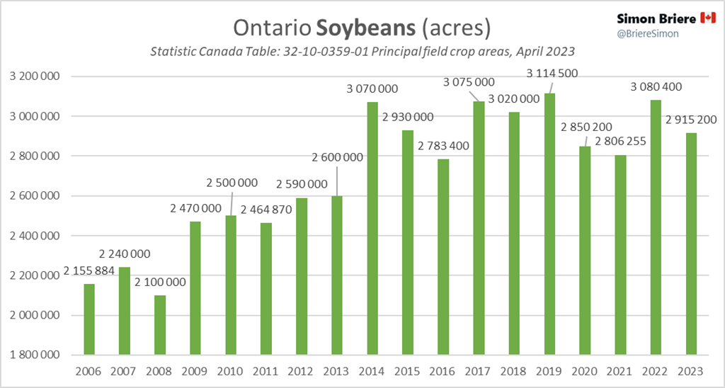 En Ontario, la plus grande province productrice de soya, les agriculteurs s'attendent à ensemencer 2,9 millions d'acres, en baisse de 5,4 % par rapport à 2022.