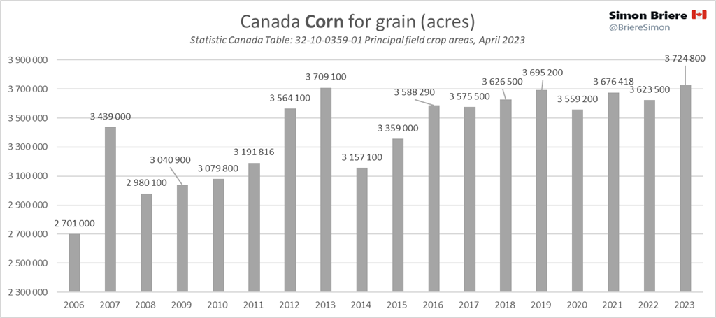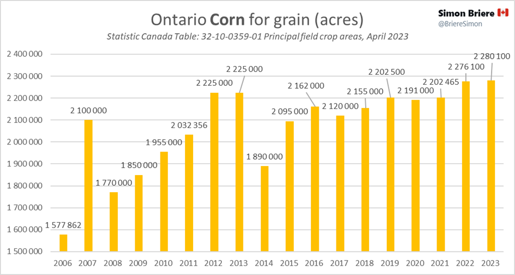 En Ontario, où 60 % de l'ensemble du maïs-grain du Canada est cultivé, les agriculteurs prévoient ensemencer 2,3 millions d'acres, en hausse de 0,2 % par rapport à 2022. Si cette prévision se confirme, il s'agirait d'une superficie record pour la province, qui dépasserait le sommet précédent atteint en 2022.