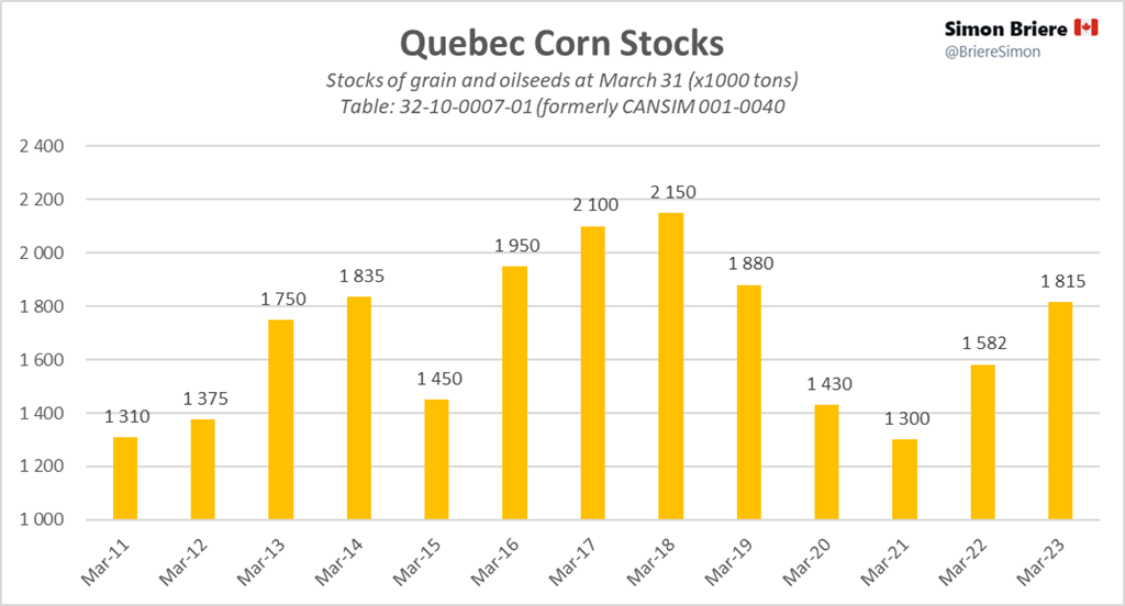 Maïs : 1.8M de tonnes en inventaire au Québec, une hausse significative par rapport aux trois dernières années qui avoisinaient 1.4M de tonnes. Bref, il y a à peu près 400 milles tonnes de plus en ce moment qu’à pareille date dans les dernières années de pandémie. Sinon 1.8M de tonnes on a déjà vu cela dans le passé en 2016-2017-2018, même plus je dirais. La différence c’est que le prix à la bourse dans ce temps-là était aux alentours de 3-4$ du boisseau, soit beaucoup plus faible qu’aujourd’hui. Abondance « relative », donc. Prix à Chicago « relativement » élevé aussi… je pense que c’est cohérent avec la pression que j’observe sur les bases locales.