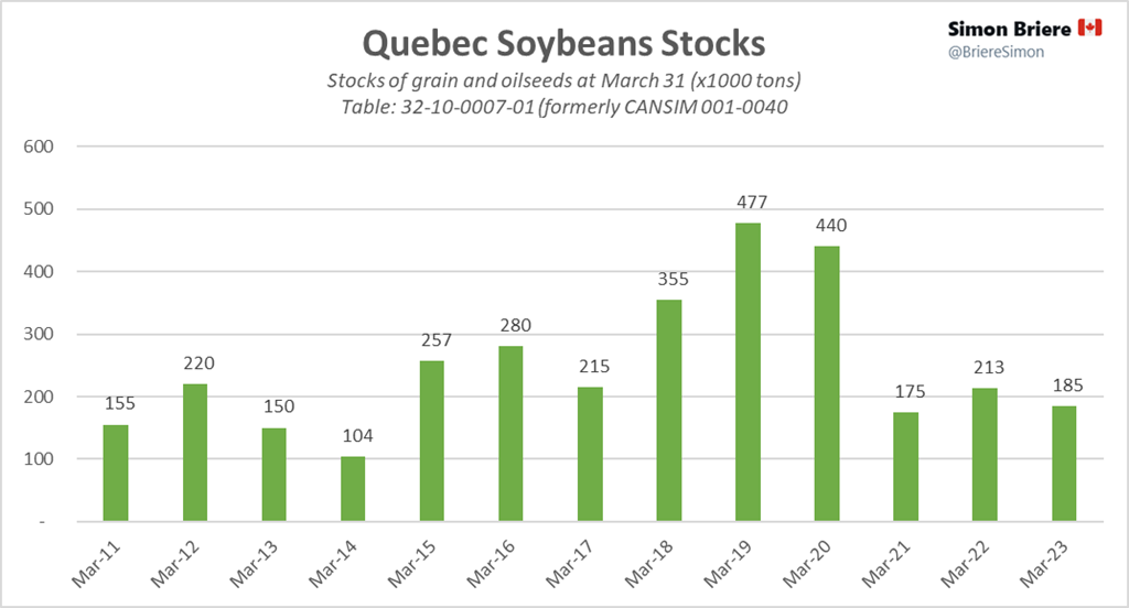 Soja : rien à signaler trop-trop… les années de surplus 2018-2020 sont derrière nous. Je me rappelle assez bien de l’abondance dans ces années-là… La Chine nous boudait. Des conflits commerciaux important. Je dis cela car en ce moment ca brasse encore sur la scène politique entre le Canada et la Chine. Espérons que tout se règlera sans de tracas sur l’exportation de matières premières agricoles.