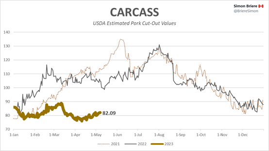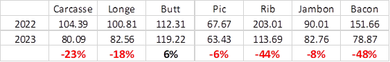 Et pour terminer, les exportations américaines de viande de porc connaissent un excellent début d’année. Officiellement, pour le premier trimestre de 2023, les exportations sont en hausse de 14% Et la tendance en avril et en mai devrait continuer. On sait que l’Europe n’est pas dans une position pour exporter cette année en raison de la baisse de leur production. Les Etats-Unis, le Canada et le Brésil sont en excellente position pour profiter du retrait du plus grand joueur mondial. De plus, la demande continue d’être excellente en Asie (excluant la Chine) alors que beaucoup de pays sont encore réticents à renouveler les cheptels de production ayant peur de la présence de la peste africaine sur leur territoire.