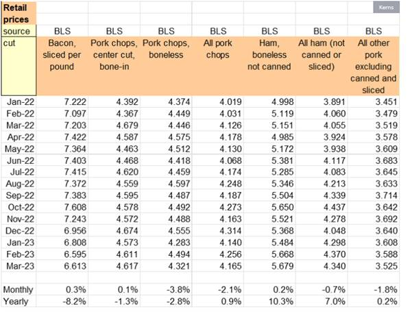 Un article qui retient mon attention provient de Joseph Kerns, publié en avril dernier. Celui-ci était abasourdi de voir les prix en épicerie demeurés stables voire même augmentés! Pourtant, il est un analyste et spécialiste du prix des viandes aux Etats-Unis… Ce n’est pas un simple quidam! Il a publié les données du USDA de mars concernant les prix moyens au détail.https://www.nationalhogfarmer.com/marketing/crimes-against-humanity-and-other-noted-fouls Il y a vraiment une dichotomie importante dans la chaine de valeur du porc….