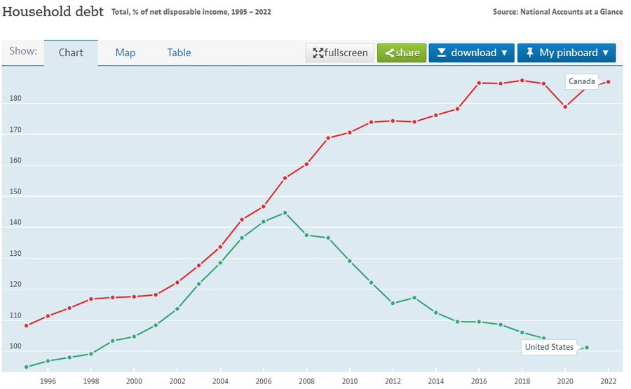 Miser sur une baisse rapide et violente des taux d’intérêts revient à miser sur des pertes d’emplois assez massive. Ok, ton hypothèque coutera moins cher… mais si tu perds ta job est tu plus avancé? L’endettement des ménage au Canada est Incroyablement élevé. Retourner à la banque renouveler l’hypothèque fera bobo. Je suis convaincu que plusieurs se croisent les doigts que les taux baisses avant l’échéance du prêt. Sinon?