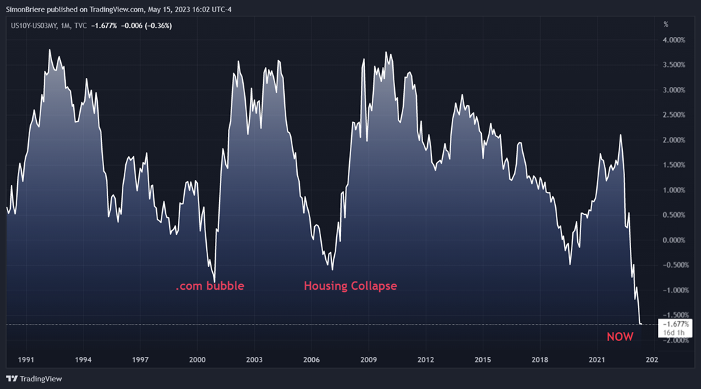 L’inflation est élevée, les taux d’intérêts aussi. Beaucoup d’endettement (personnel et gouvernement). On prévoit donc un ralentissement économique (récession). Certains indicateurs nous montre clairement le chemin que pourrait prendre l’économe. Le différentiel de taux d’intérêt ; la différence entre le taux court terme et le taux long terme. Prenons aux USA le taux des obligations 10 ans à 3.50%