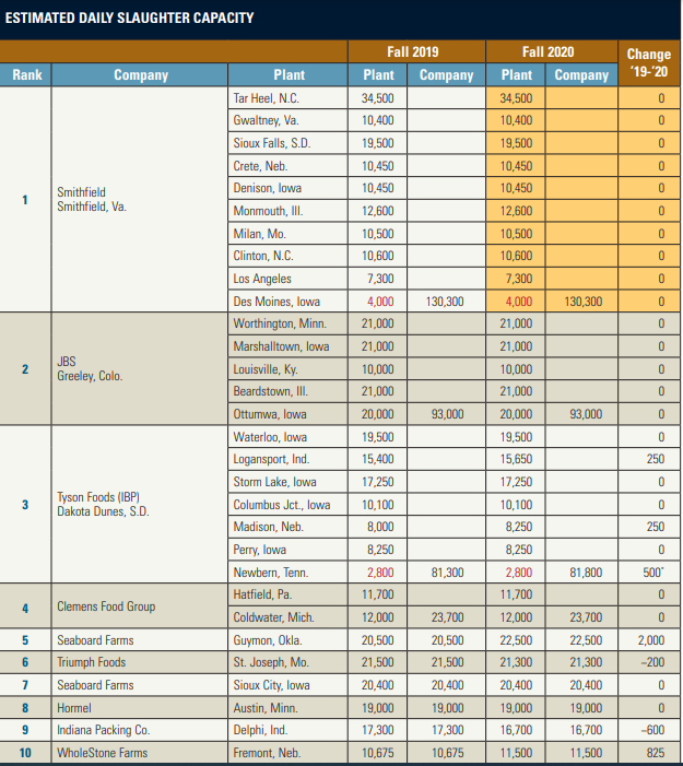 En 2020, un article avait fait le recensement de la capacité d’abattage aux Etats-Unis.https://cet.gcp.informamarkets.com/sites/cet.com/files/nhf-porkpackerreport_0.pdf
