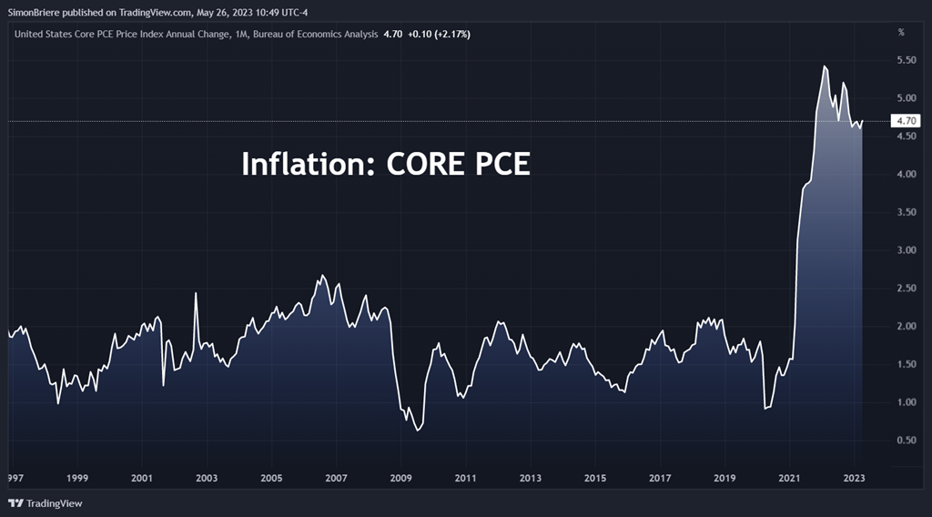 Ce matin plusieurs indicateurs économiques ont été publiés et…. Rien de bon… Ben… rien de bon dans le sens que ça va trop bien et que ça risque de pousser les taux d’intérêt encore plus haut et/ou plus longtemps. Ça va trop bien aux États-Unis en termes de consommation, d’emploi, de dépenses pis de salaire pis de cash pis de toute. La grosse machine à dépenser est bien vivante. Je mettrai les charts plus bas.