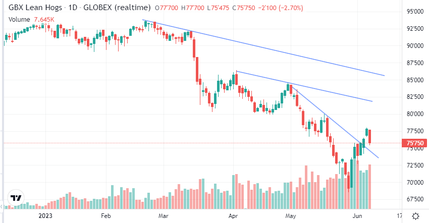 Le prix du porc a effacé les pertes des deux dernières semaines (ou presque) et ça fait un bien fou à fou à voir! Le fait que nous ayons traversé certains niveaux techniques est intéressant mais que faut-il penser de la situation présente? Doit-on redevenir optimiste? Doit-on se précipiter et vendre d’avance tout ce qu’on produit et produira? Graphiquement les prix ressemblent à quoi? Si on regarde le contrat d’octobre 2023, on peut noter que la tendance baissière très court terme (1 mois) semble être terminée. Le fait d’avoir franchi la ligne baissière établie en mai est une première bonne nouvelle. Reste à voir si on est capable de remonter vers le niveau de $80 USD / livre. Je crois bien qu’il sera possible d’y aller dans les prochaines semaines parce que les fondamentaux semblent nous indiquer que la situation se corrige pour le mieux!