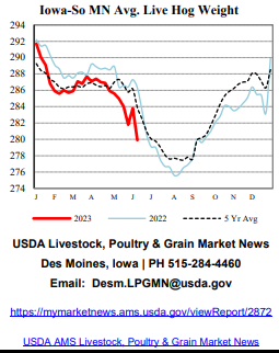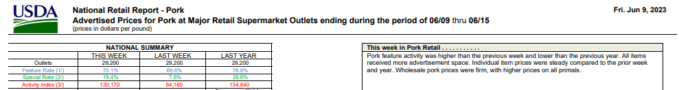Il existe peut-être aussi un phénomène d’achat pour livraison rapide et vente rapide avant la règlementation du 2 juillet qui entre en vigueur en Californie. Les consommateurs se sont peut-être rués pour acheter le produit avant les hausses de prix? Pourtant, les épiceries ne semblaient pas accélérer le pas pour promouvoir le porc. En fait, ils offraient moins d’espace promotionnelle que l’an dernier…. Et pour terminer, des sénateurs essaient de réintroduire une législation pour forcer la Californie à abandonner ou, du moins, restreindre l’application de la Proposition 12 aux États-Unis. (le fameux ‘’Exposing Agricultural Trade Suppression Act).