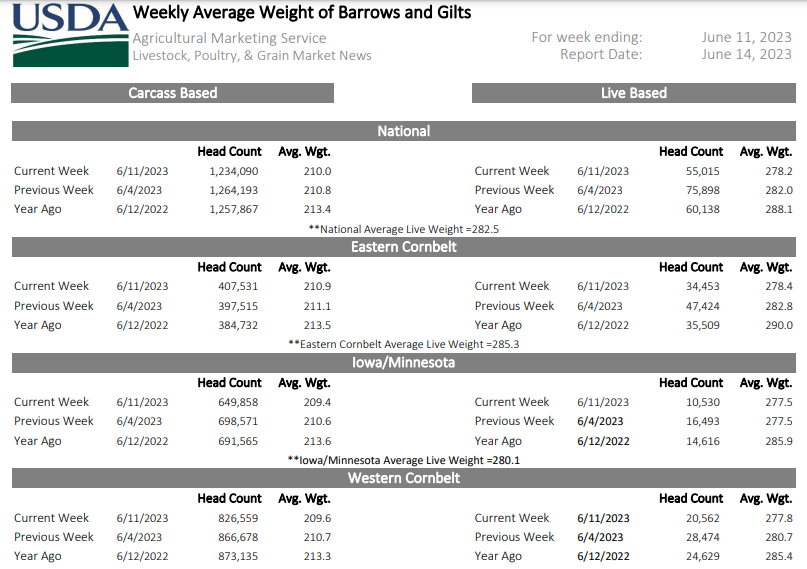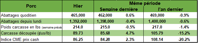 Encore une fois, 2 phénomènes contribuent peut-être à la montée des prix : 1) la diminution (lente) du nombre de porcs disponibles et 2) le poids anormalement bas des porcs vivants et carcasses versus les moyennes des dernières années. Depuis 3 semaines maintenant, les abattages hebdomadaires proposent une très légère baisse du nombre de porcs. Évidemment, les abattages du samedi font une grande différence, mais pour les 3 premiers jours de la semaine, nous sommes en baisse de 0.6% Le poids des porcs est aussi surprenant puisque celui-ci baisse à vue d’œil! Dans certaines zones, on parle d’une baisse de 10 livres vivants et 3 livres carcasses! Au final, juste moins de viande!