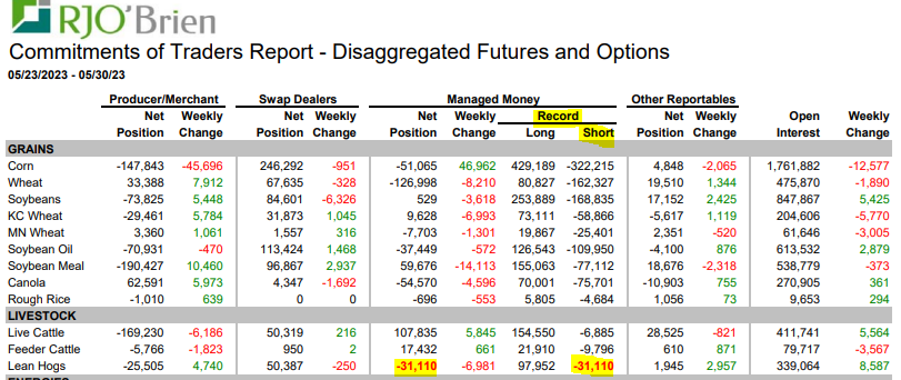 Les spéculateurs sont occupés ces temps-ci à couvrir leurs positions vendeurs dans le marché du porc et liquider des positions acheteurs dans le bœuf. Longtemps nous avons parlé de l’écart historiquement élevé entre ces deux produits et bien depuis la fin de la semaine dernière, on sent bien que ce spread commence à se rétrécir. Les fonds étaient vendeurs de 31 000 contrats (c’était un record) il y a 2 semaines dans le porc. Ceux-ci ont dû racheter presque toute leur position au cours des derniers jours. La semaine dernière, ils avaient réduit de moitié leur positionnement. Et cette semaine? On le saura ce vendredi, mais le prix du porc grimpant de façon si forte, il ne faudrait se surprendre si les fonds avaient effacé toutes leurs positions vendeurs avant de perdre leur argent! La grande question maintenant : Oseront-ils devenir acheteurs nets ?