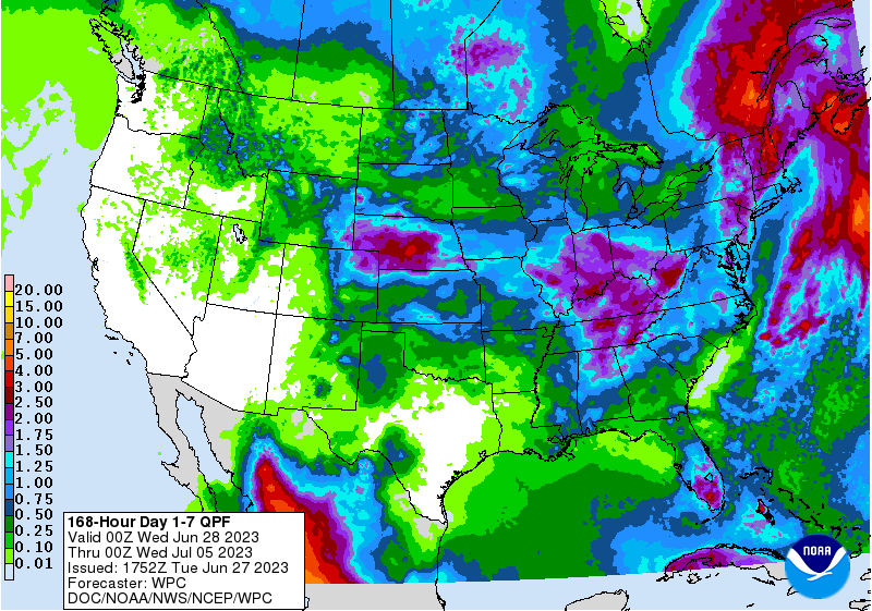 Et le devant, c’est des cartes météo beaucoup plus clémentes avec un à deux pouces d’eau dans les régions qui en ont plus besoin. Les prix sont à la baisse car les éléments négatifs pour les prix ont repris dessus sur les éléments positifs parce qu’en fait, il y a pas mal juste la météo de positif car la demande tombe à plat. L’éthanol roule moins vite, l’exportation américaine est un désastre, il y a moins d’animaux à nourrir…. Bref tous les éléments de la demande sont en danger au moment où le Brésil a une récolte record est un escompte significatif sur le prix américain.