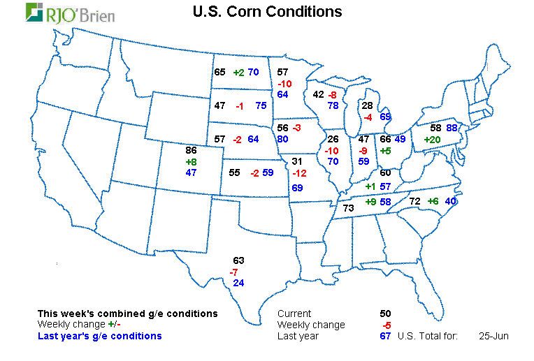 - Maïs : Condition en baisse de 5% à 50 % bon/excellent vs 67 % l'année dernière