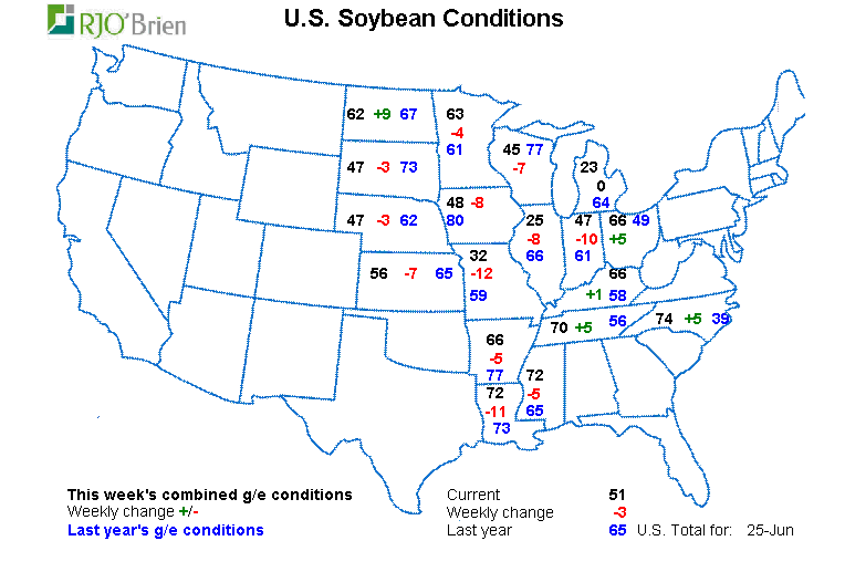 - Soja : Condition en baisse de 3% à 51 % bon/excellent vs 65 % l'année dernière