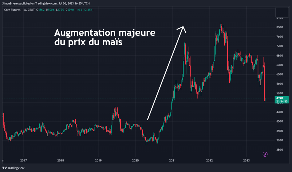 Que le coût de production soit élevé ou faible, ça n’a presque pas d’influence à court terme. Tu veux une preuve? Parle à un éleveur de porc. Demandes-lui comment ça feel d’aller livrer des cochons à 220$ du 100kg à l’indice quand tu as payé du maïs à 450$ la tonne et du tourteau encore plus cher. En fait l’impact de ce genre de situation est beaucoup plus lent à s’opérer. Dans les cas des éleveurs, la situation a particulièrement été difficile depuis 2020 au moment où le grain a commencé à devenir très cher.