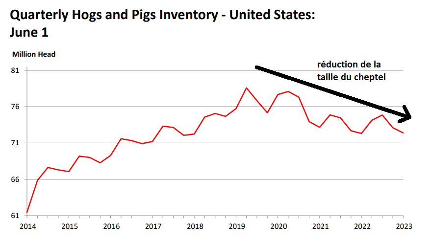 À court terme, l’augmentation du coût d’alimentation a réduit fortement la rentabilité financière des fermes d’élevage. Tu te dis… bon cette année c’est moins bon, mais l’an passé on a fait du cash. Ok. C’est correct une fois de temps en temps d’avoir une moins bonne année. Mais là, ensuite, tu en as une autre. Une deuxième moins bonne année. Puis encore. Une troisième. Ainsi de suite… Alors on fait quoi? On en fait moins. On ralenti la production. De ce fait, en réduisant la production on obtient certains résultats avec le temps.